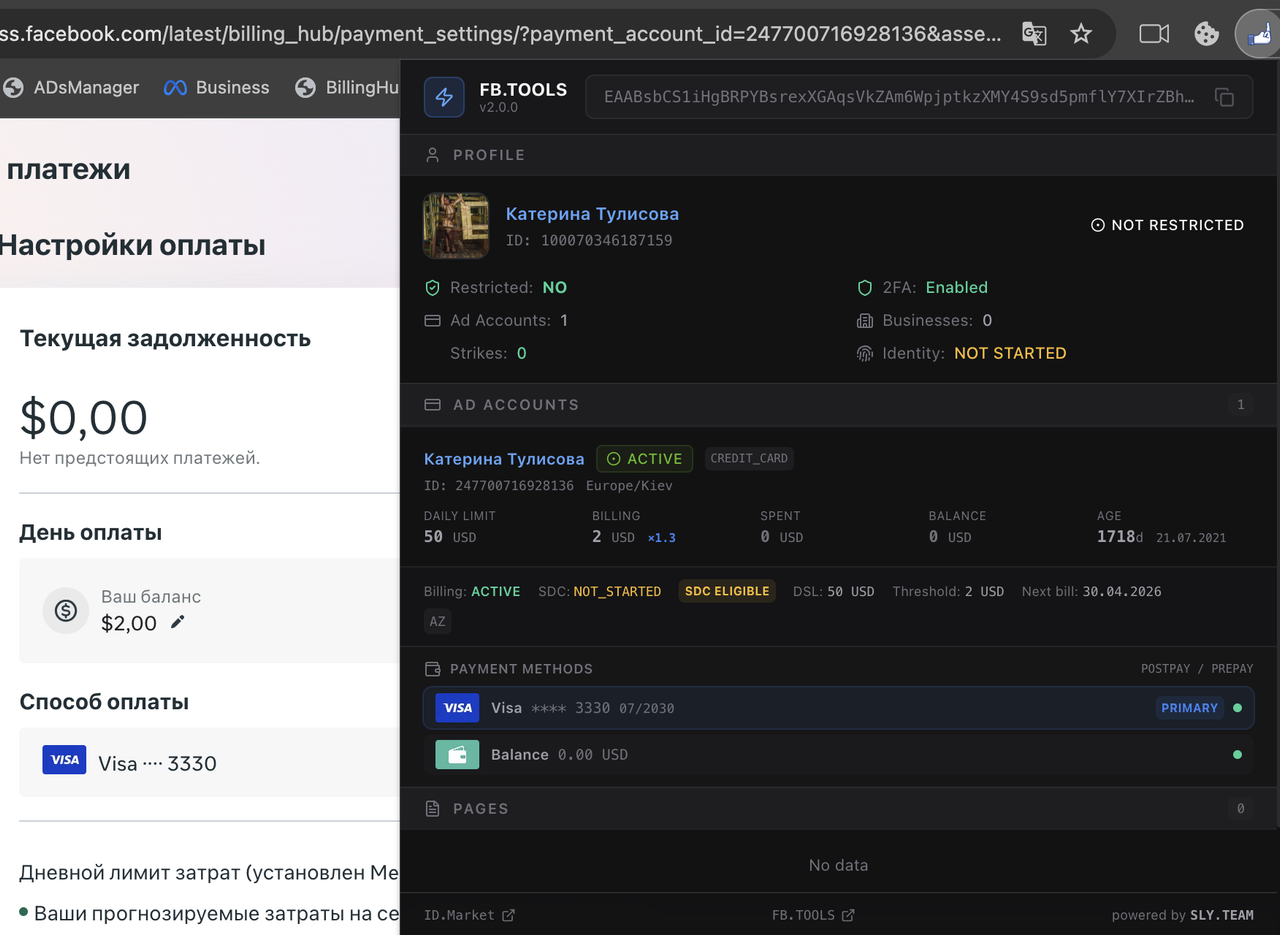 Комплектация: Cookies, Token EAAB, Email (почта может быть не рабочая), 2FA.